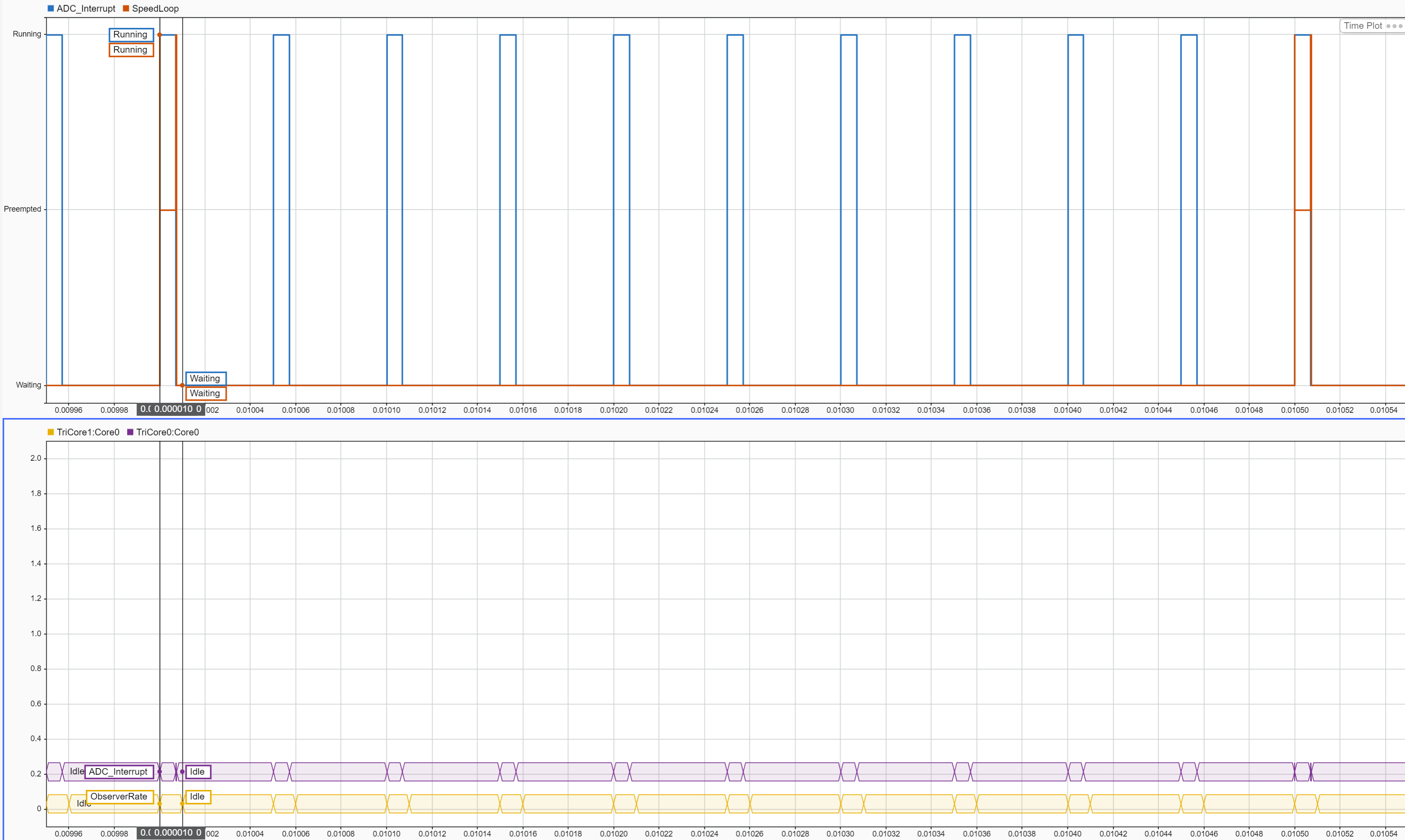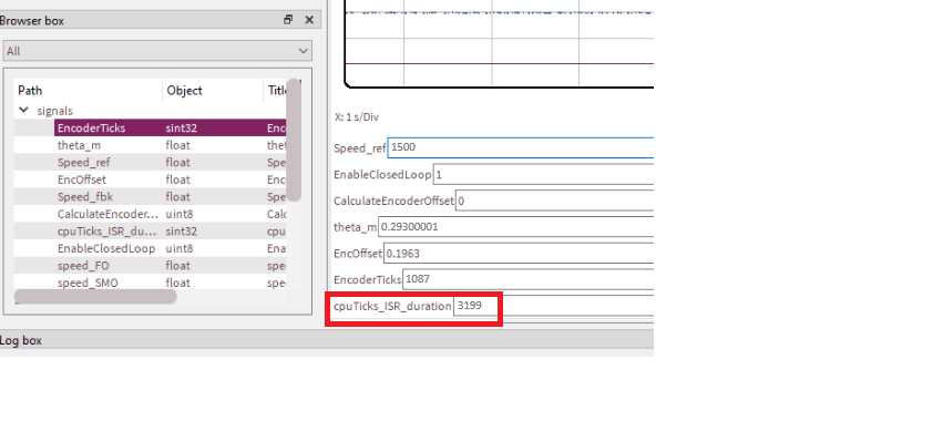 10. Observe the ADC interrupt task duration from the logged variable cpuTicks_ISR_duration.