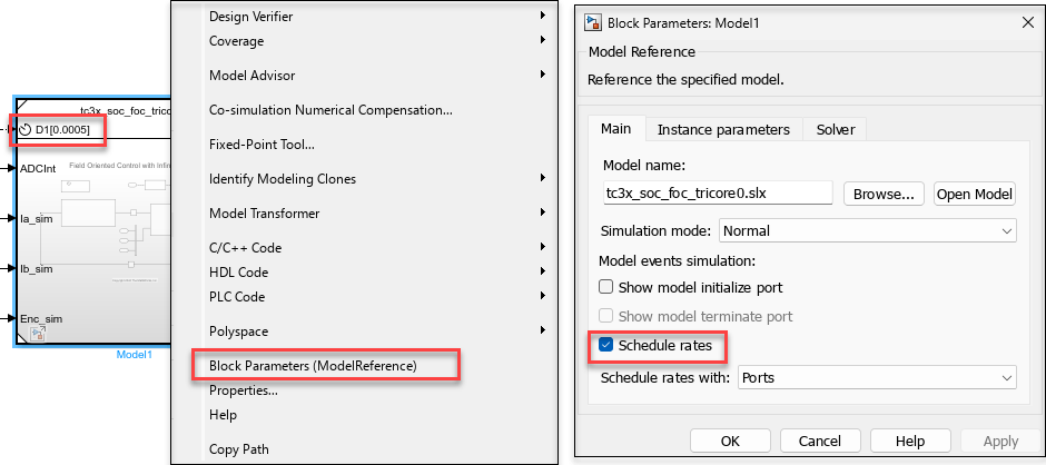 7. To view the scheduling port in the Model block connected to the Task Manager block, right-click on the core specific Model block and go to Block Parameters (Model Reference) to enable Schedule rates.