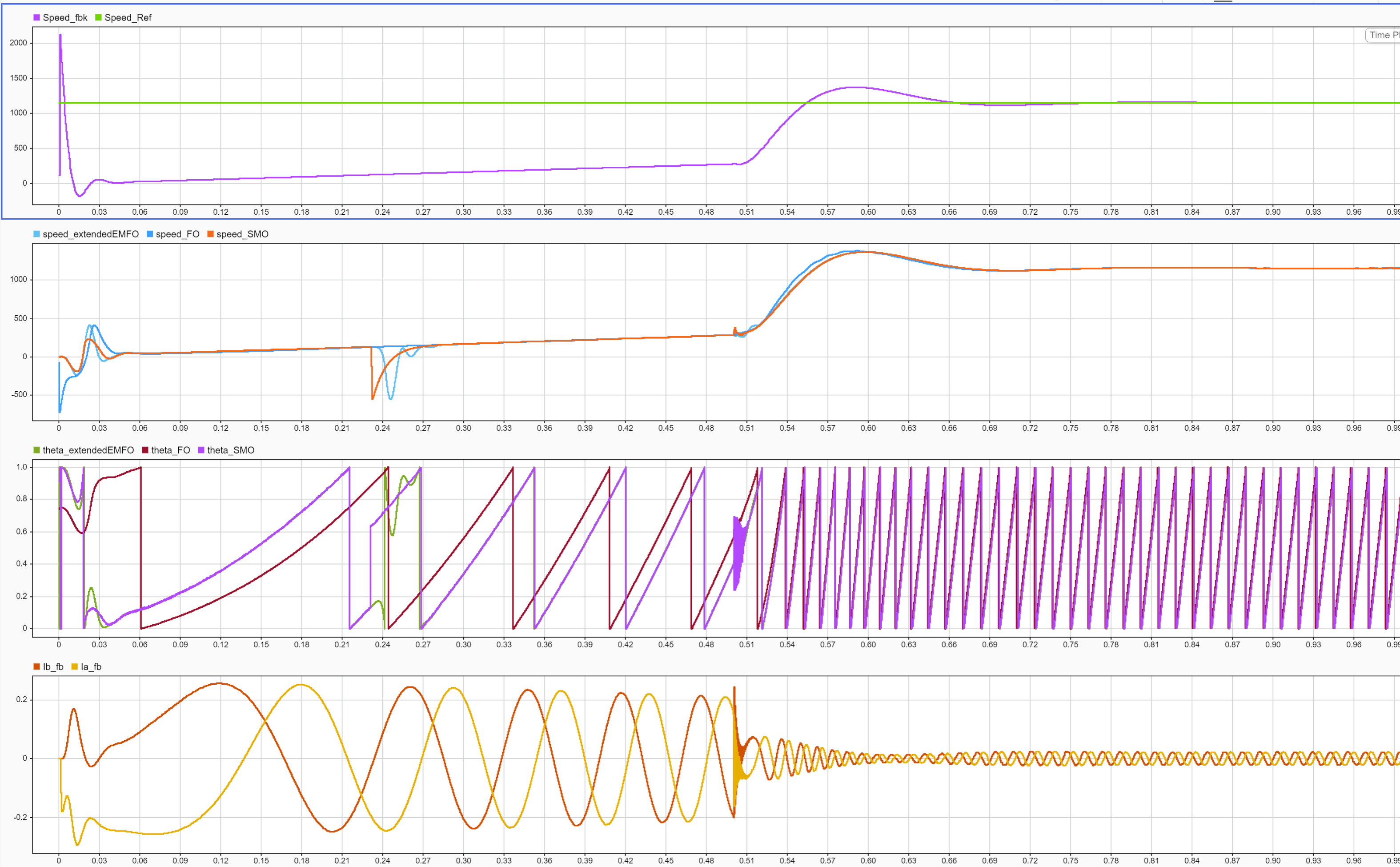 3. Click Data Inspector on the Simulation tab to view and analyze the basic signal simulations, such as speed feedback and outputs from the sensorless algorithms (flux observer, sliding mode observer, and extended EMF observer).