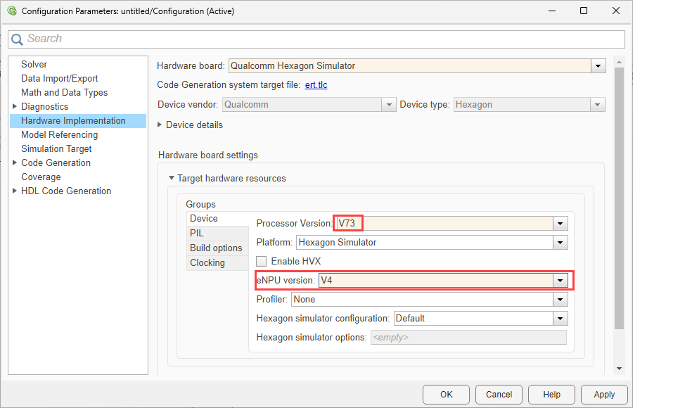 In the Configuration Parameter dialog box, click Hardware Implementation.