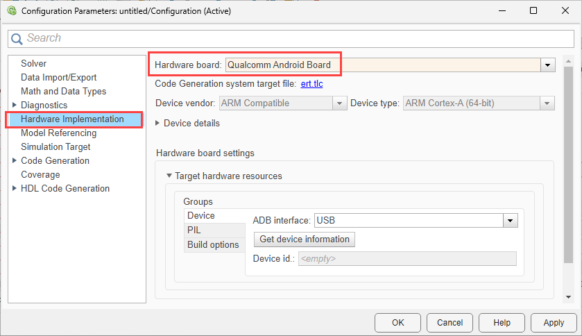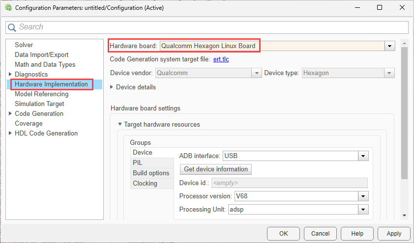 | Platform | Select the device platform for the selected hardware board. | Hexagon Simulator |