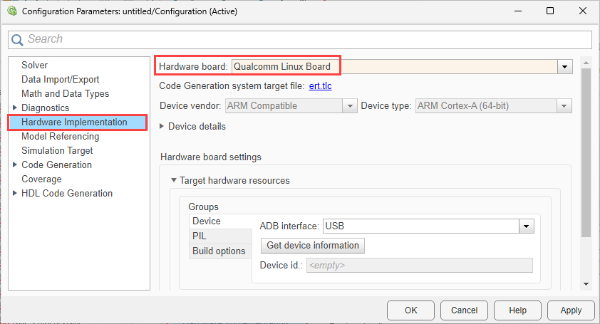 In the Configuration Parameter dialog box, click Hardware Implementation.