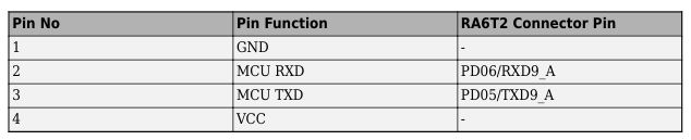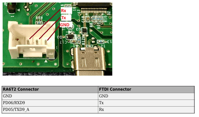When using an FTDI adapter for communication between the host computer and the Renesas RA6T2 target board, make the following connections.