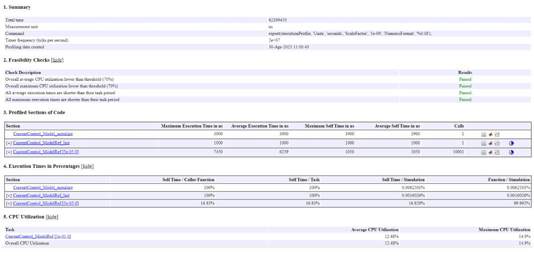 When PIL simulation ends, a task profiling report is generated. You can also access this report from the bottom right corner of the model, as shown in this image