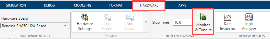 1. In the Simulink toolstrip, click Hardware and then click Monitor & Tune.