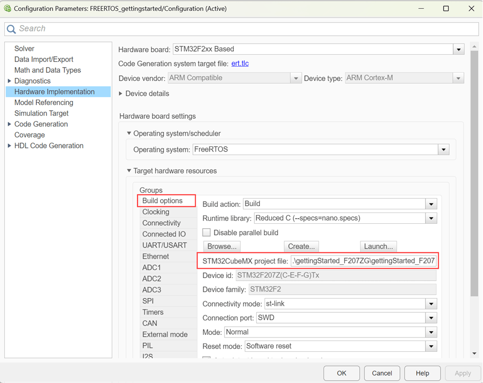 4. Go to Build options and click Browse to select gettingStarted_F2027ZG.ioc STM32CubeMX project file. For more information on STM32CubeMX Project, see Getting Started with STMicroelectronics STM32 Processor Based Boards.
