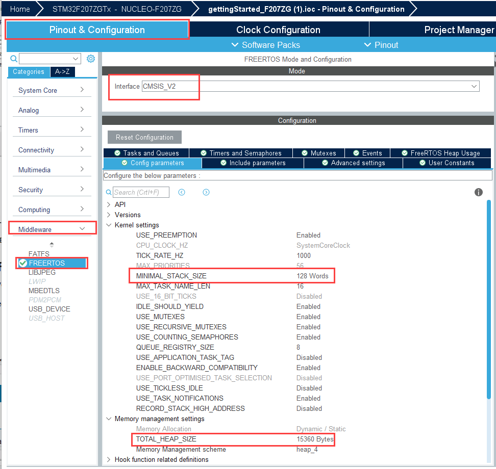 4. Select the Interface as CMSIS_V2 in STM32CubeMX > Middleware > FREERTOS > Interface.