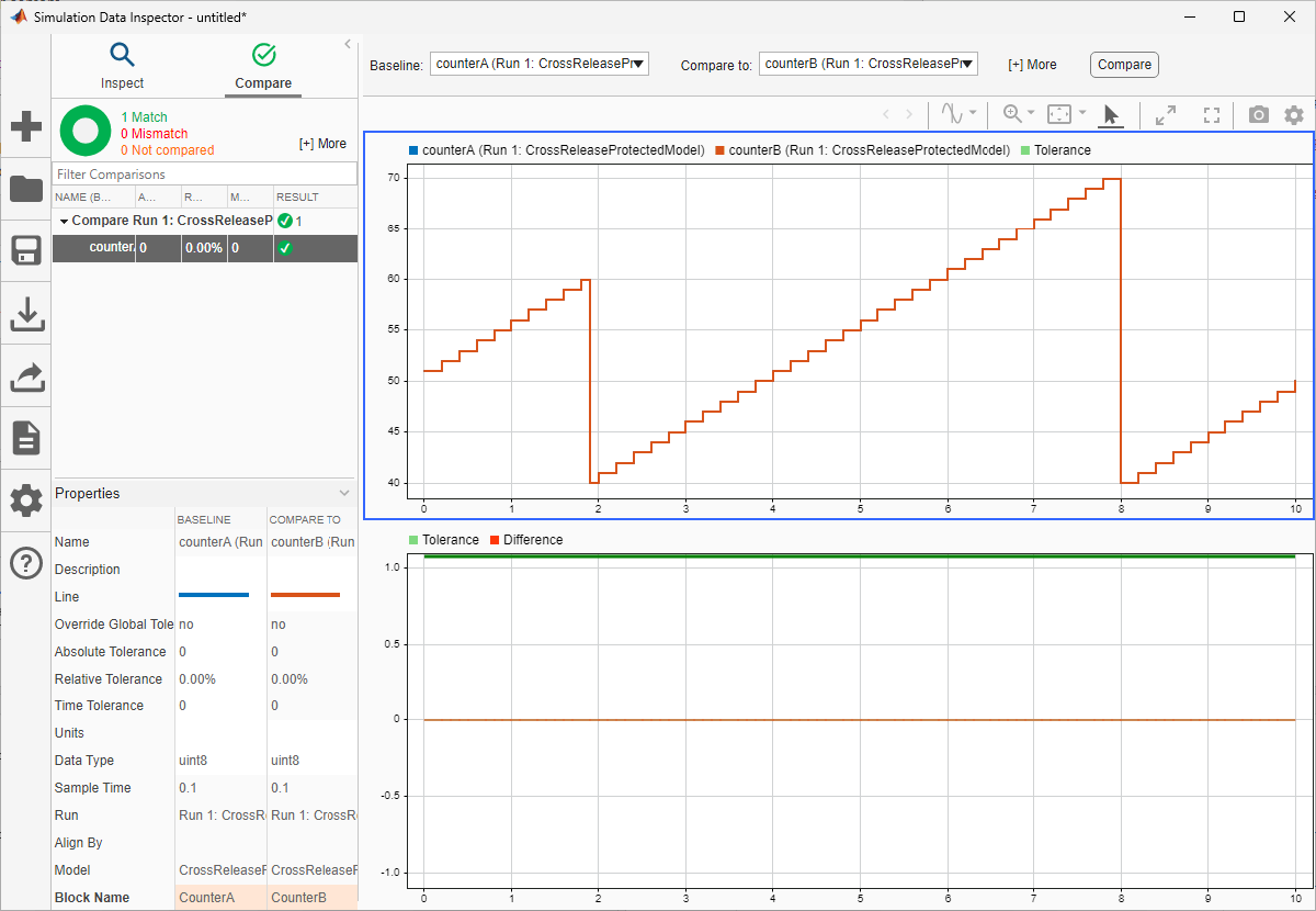 simulationRunObj = Simulink.sdi.getCurrentSimulationRun(model); counterASignal = getSignalsByName(simulationRunObj, 'counterA'); counterBSignal = getSignalsByName(simulationRunObj, 'counterB'); Simulink.sdi.compareSignals(counterASignal.ID, counterBSignal.ID); Simulink.sdi.view(Simulink.sdi.GUITabType.CompareRuns);