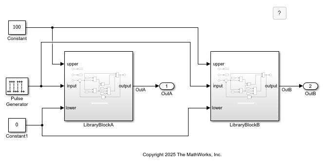 Open the libraryRef2 model. libraryRef2 contains two instances, LibraryBlockA and LibraryBlockB, of the same linked library block from the faultedCounterLibrary library. However, libraryRef2 is not synchronized, and the block in faultedCounterLibrary contains a fault. This fault in does not appear in the parent model in either the LibraryBlockA and LibraryBlockB instances.