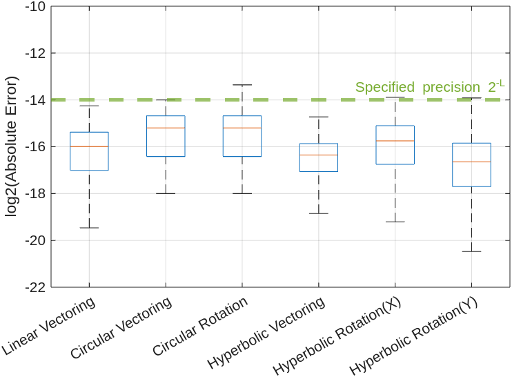For all the CORDIC modes, with fraction length of L+log2(L+integerLength) and maximum shift value L+integerLength, the absolute error is less than or equal to 2^-L. This indicates that this configuration, where you specify a fraction length of L+log2(L+integerLength)and maximum shift value L+integerLength, can be shared across other CORDIC modes with comparable results.