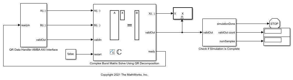 The Complex Burst Matrix Solve Using QR Decomposition block outputs data one row at a time. When a result row is output, the block sets validOut to true. The rows of X are output in the order they are computed, last row first, so you must reconstruct the data to interpret the results. To reconstruct the matrix X from the output data, use the helper function matrixSolveModelOutputToArray.