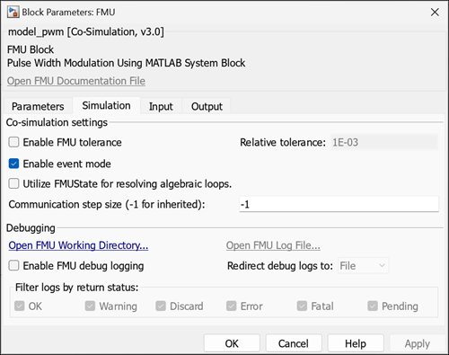 exportToFMU(model_for_export,'FMIVersion','3.0','FMUType','CS',... 'ConstantPeriodicClock','on');