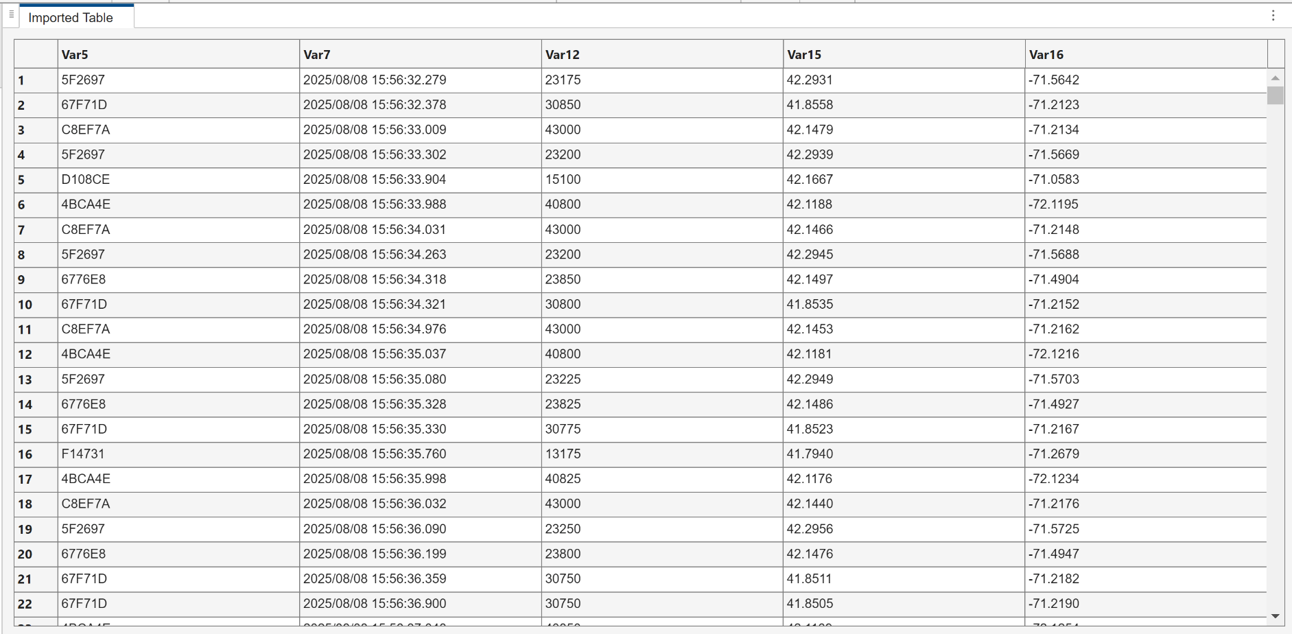 This example utilizes a segment of recorded ADS-B data saved as a text file "ADSBData.txt", which contains ADS-B data near Boston area. You can read the data into a table variable in workspace by using the readtable function as follows.