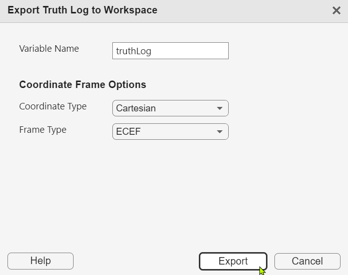 The export dialog box appears and you can specify the name of the variable to be exported to MATLAB workspace. You can also change the coordinate frame for exportation. For example, you can change the output frame to the ECEF (Earth-Centered-Earth-Fixed) frame by selecting Coordinate Type to Cartesian and selecting Frame Type to ECEF. After that, click on the Export button to export the truth log to the workspace.