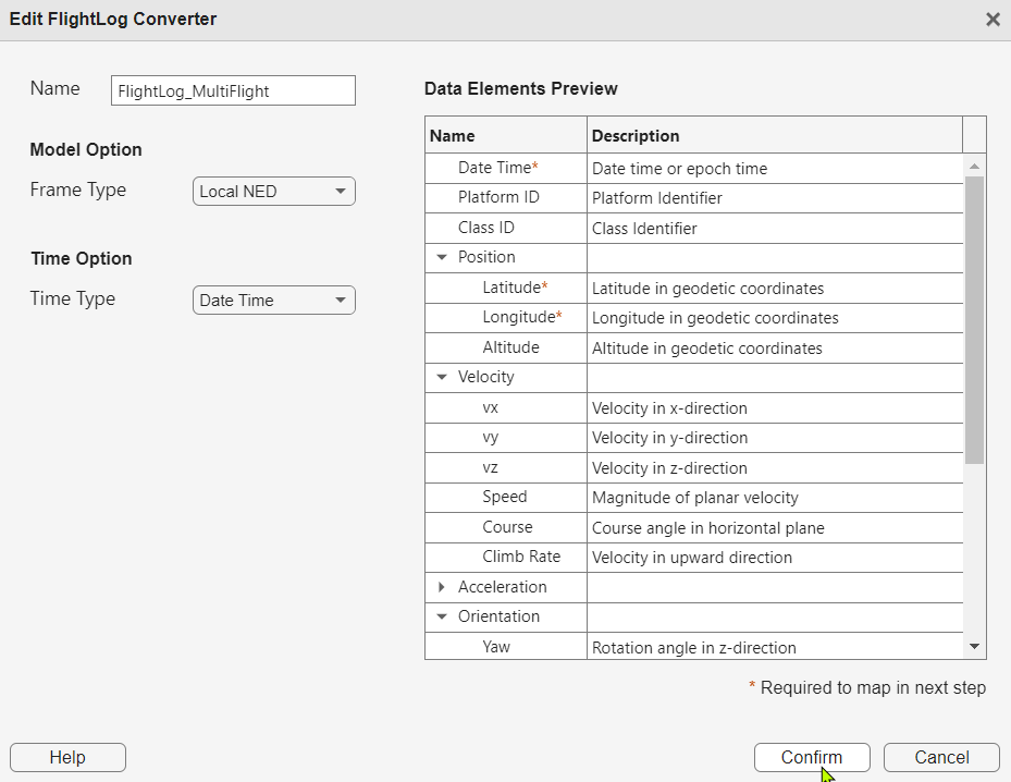 Since the flight log data is recorded in the local NED frame and the time type is described in terms of month, day, year, and so on, you use the default configuration by clicking the Confirm button. The the FlightLog1 converter now becomes the current converter and a mapping panel shows on the left. You can then map the raw data columns to the data elements.