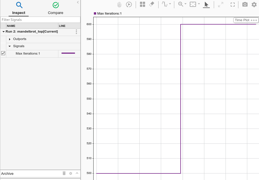 To tune the maximum iterations of the Mandelbrot algorithm, double-click on the Constant block while the simulation is running in external mode. Set the Constant Value parameter to 600. The Simulation Data Inspector reflects the new value of this parameter.