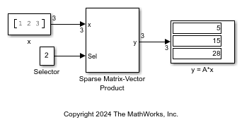and the input vector x as [1,2,3]. There is a Selector block to select the required matrix configuration based on specified indices. The Selector block has zero-based index mode where an index of 0 specifies the first element of the input vector. Therefore, for a 3-D input signal, 0, 1, and 2 are the valid input elements. In this example, the value of input for Sel is 2. For more information, see Selector.
