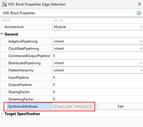 Alternatively, you can set synthesis attributes for blocks or subsystems in the Simulink model. Right-click a block and in the HDL Coder app section, select HDL Block Properties. Click the Edit button for the SynthesisAttribute parameter and specify names and values of attributes in the table.