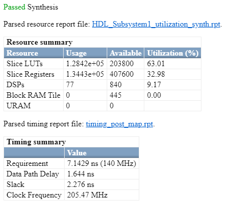 HDL Coder synthesizes the HDL code on the target platform and generates area and timing reports for your design based on the target device that you specify. You can run logic synthesis for a specified FPGA device and get the synthesis reports.