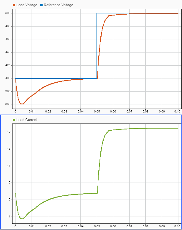 sim("sschdlexDualActiveBridgeExample"); % Clear all plotted signals from subplots and set a 2-by-1 grid layout Simulink.sdi.clearAllSubPlots Simulink.sdi.setSubPlotLayout(2,1); % Get the latest run identifiers allIDs2 = Simulink.sdi.getAllRunIDs; runID2 = allIDs2(end); run2 = Simulink.sdi.getRun(runID2); run2.name = "Simscape Desktop Simulation"; % Plot the DAB converter output signals in the Simulation Data Inspector plotOnSubPlot(run2.getSignalsByName("Reference Voltage"),1,1,true); plotOnSubPlot(run2.getSignalsByName("Load Voltage"),1,1,true); plotOnSubPlot(run2.getSignalsByName("Load Current"),2,1,true); Simulink.sdi.view;