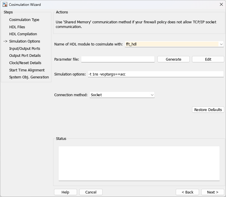 From the list, select fft_hdl. This module is the Verilog module you use for cosimulation. If you do not see fft_hdl in the list, enter the file name manually.