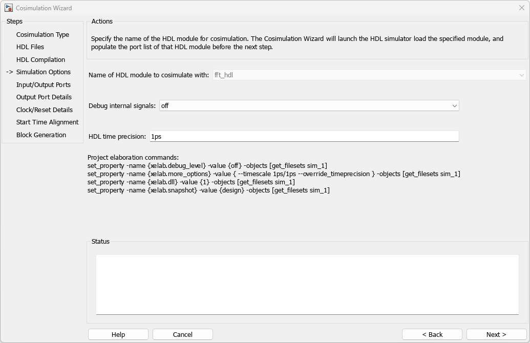 b. Click Next. The Cosimulation Wizard launches the HDL simulator in the background console using the specified HDL module and simulation options. When the wizard launches the HDL simulator successfully, the wizard populates the input and output ports on the Verilog model fft_hdl and displays them in the next step.