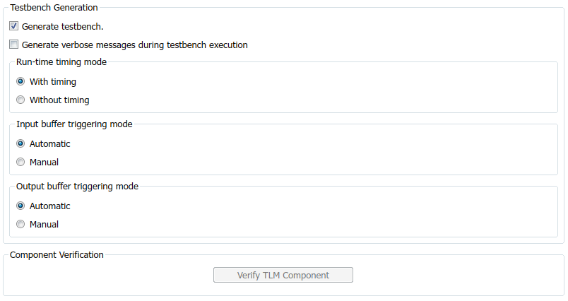 These options control generation of an automatic testbench that compares your generated TLM component with your Simulink® model. This testbench is not supported if you generate a TLM component for an operating system different than your MATLAB® host machine.