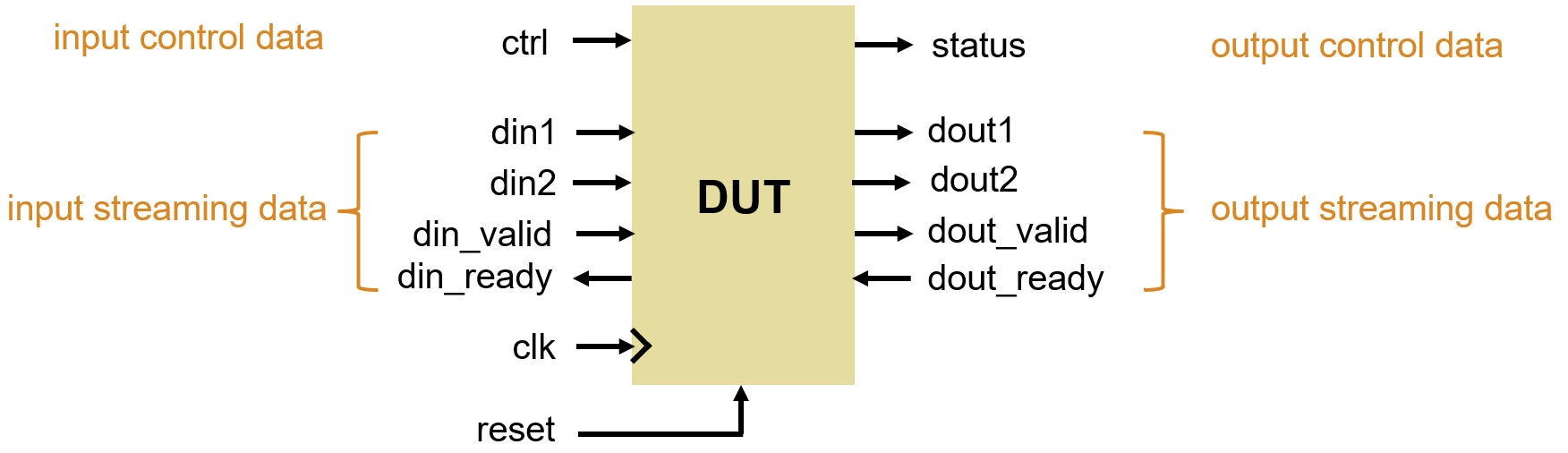A data ready signal is optional for handling backpressure from downstream data. If the DUT has data ready signal for output streaming, the data valid signal must deassert within one clock cycle after data ready signal deasserts. If the DUT doesn't have data ready signal, a clock enable signal is required.