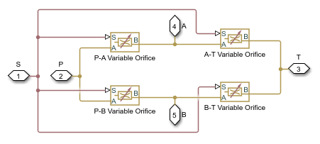 hPA, hPB, hAT, and hBT are the orifice openings of the P-A, P-B, A-T, and P-B flow paths. The orifice openings are computed during simulation.