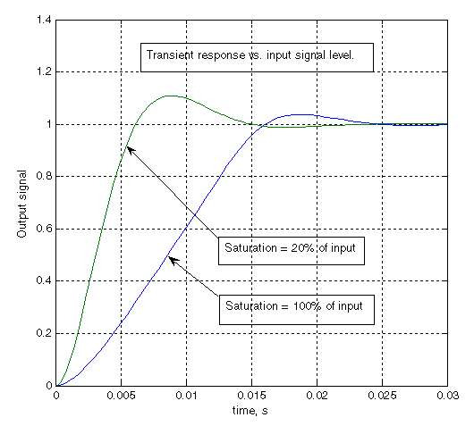 The typical transient responses of a servo-valve or a high-quality proportional valve are shown in the following figure. The only difference between the two responses in the figure is the value of the saturation.