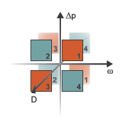 A total of four operation modes are possible. The working mode depends on the pressure drop from port A to port B (Δp), on the angular velocity at port S (ω), and on the instantaneous volumetric displacement of the component (D). The Operation Modes figure maps the modes to the octants of a Δp-ω-D chart. The modes are labeled 1–4: