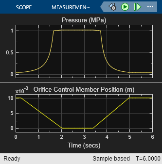 The plots below show the behavior of the pressure relief valve. As the load orifice closes, pressure in the system rises. When the system pressure reaches the pressure setting for the pressure relief valve, the valve opens which diverts flow away from the orifice and allows the system to maintain the set pressure of the pressure relief valve.