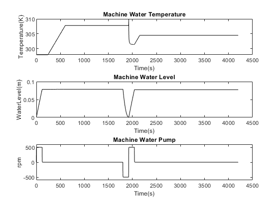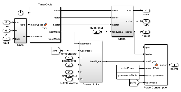 This example shows how to model a dishwasher and introduce a fault in its operation. Observe the system response when a fault occurs in the water heater during operation. The electric motor switches off, and the dishwasher aborts operation.