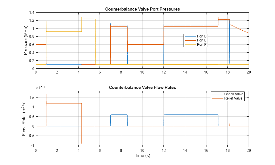 The plots below show the port pressures and flow rates of the counterbalance valve.
