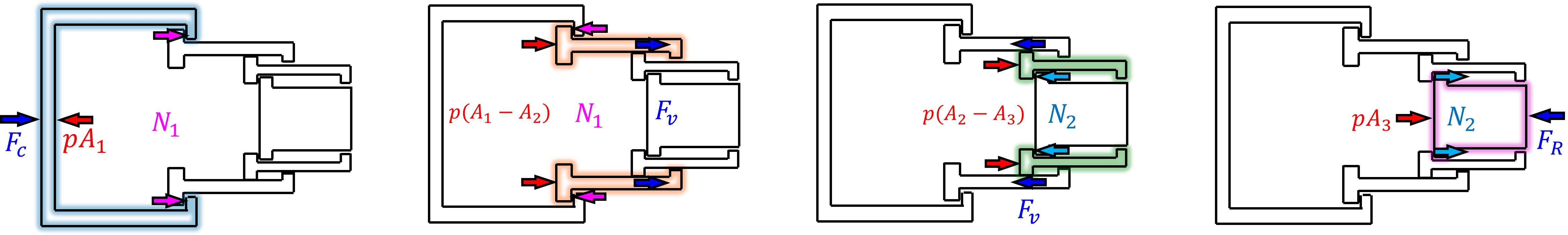 where Fc and FR are the forces at port C and R, respectively, and N represents a hard-stop force, and Fv is the viscous force associated to the movement of the second stage. The sum of all equations gives Fc=FR. The diagram shows how the forces on the free body diagrams manifest across the network.
