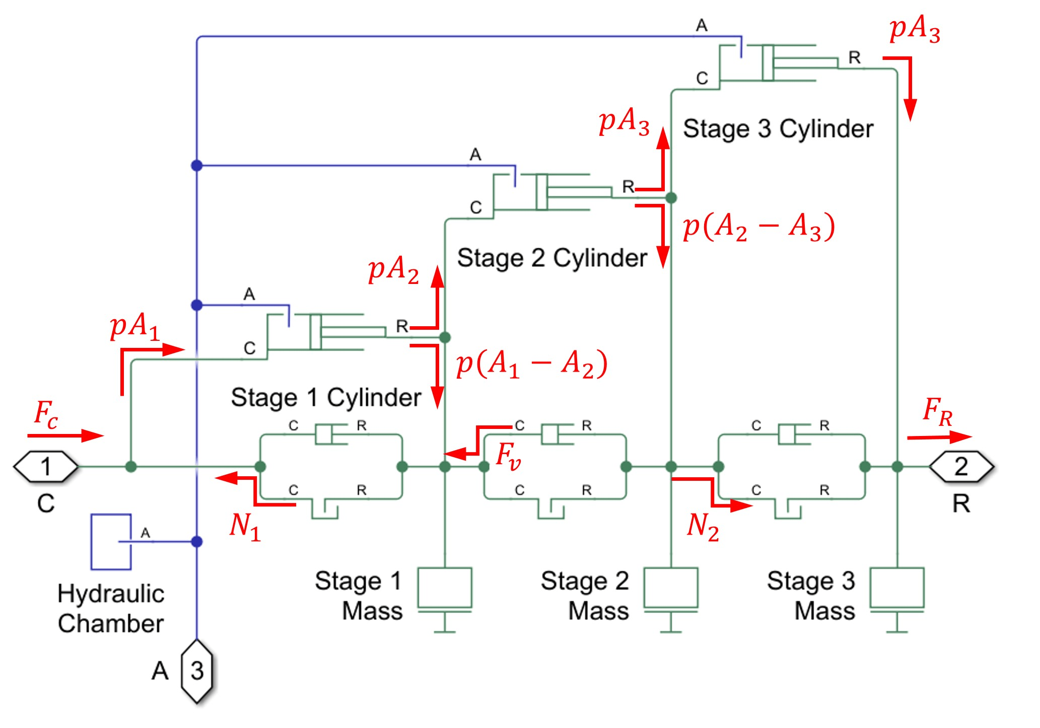 The cylinder extends and retracts each stage sequentially. This behavior happens because the stages are subject to the same fluid pressure p while having different effective areas A1,A2,A3. For example, when the first stage extends or retracts, its force pA1 is sufficient to bear the external load, whereas the forces of the subsequent stages are not.
