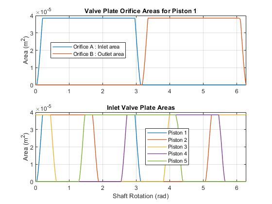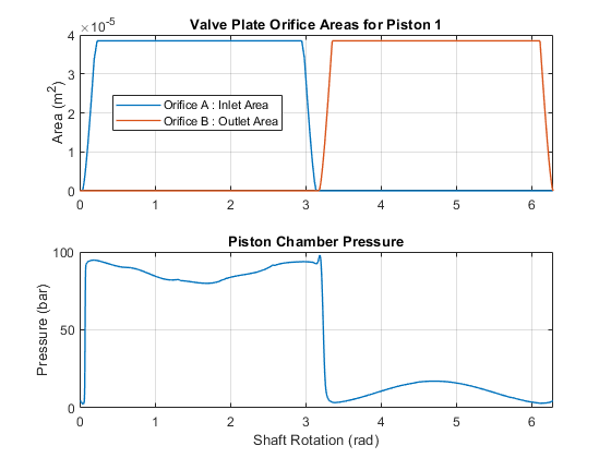 This plot shows in the first subplot the area profiles of the valve plate geometry. The second subplot shows the piston chamber pressure variation with respect to the cylinder block rotation.