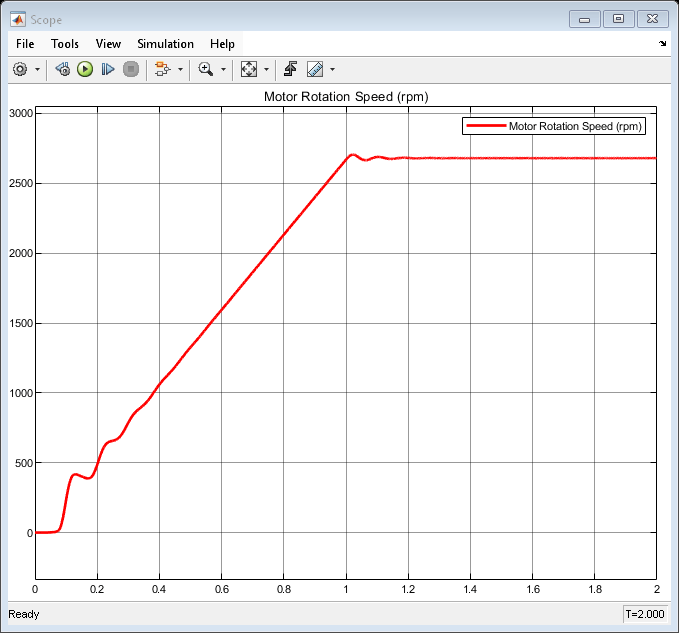 This plot shows the speed of rotation of the axial-piston motor. The speed is proportional to the inlet flow to the motor.