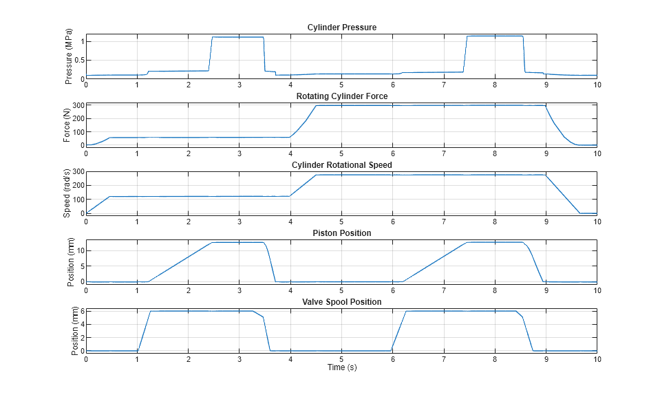 The example simulates two actuator cycles. The two strokes occur with rotational speeds of 120 rad/s and 275 rad/s, respectively. The first two plots below show the cylinder pressure, which generates the static pressure force, and the rotating cylinder force, which is caused by the centrifugal force acting on the fluid within the cylinder. Because of the higher rotational speed, the second stroke exhibits a higher cylinder pressure and a higher rotating cylinder force.