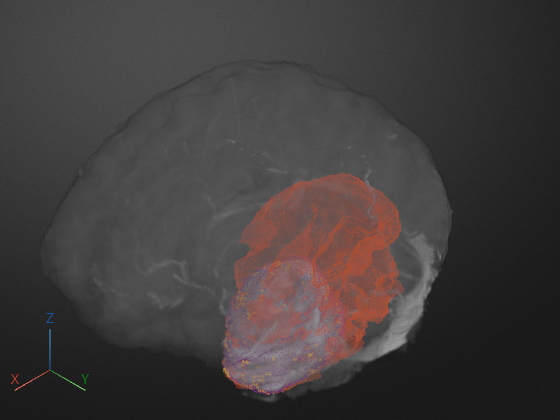 This example shows how to explore 3-D labeled volumetric data using the Volume Viewer app. Using the app, you can view the labels by themselves or as an overlay on the intensity volume. To illustrate, the example loads an intensity volume that shows the human brain with labeled areas that show the location and type of tumors found in the brain.