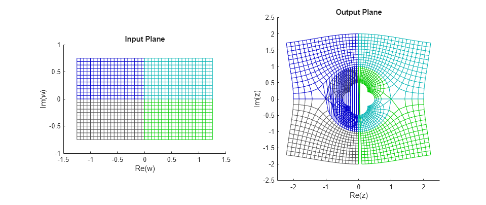 f3 = figure('Name','Conformal Transformation: Grid Lines'); axIn = conformalSetupInputAxes( subplot(1,2,1)); axOut = conformalSetupOutputAxes(subplot(1,2,2)); conformalShowLines(axIn, axOut, t1, t2) % Reduce wasted vertical space in figure f3.Position = [1 1 1 0.7] .* f3.Position;
