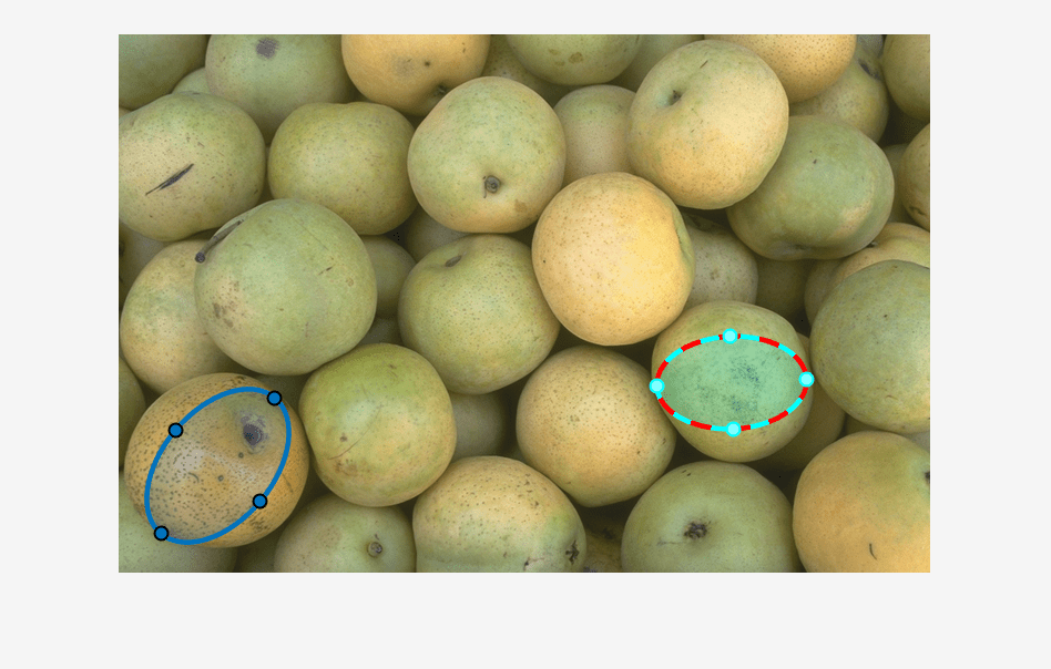roi2 = uidraw(viewer2,"circle",Position=[450 204 70],Color="r",Label="Pear");