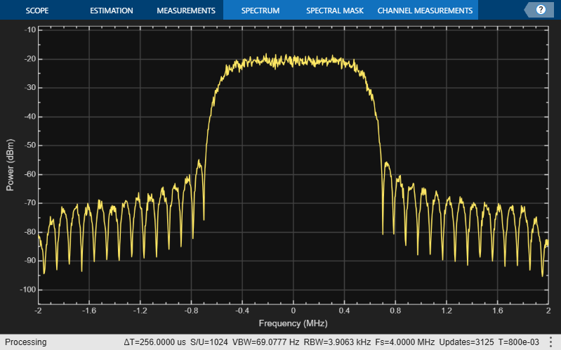 rxWaveform = rxWaveform.'; specAn = spectrumAnalyzer(SampleRate=Fsamp); specAn(rxWaveform)