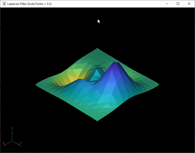 Laplacian filter — Repeatedly moves each adjustable vertex to the weighted average of the vertices adjacent to it. The weights assigned to neighboring vertices depend on their connectivity with the adjusted vertex. The Laplacian filter is suitable for surface meshes that have various densities of vertices in different regions.