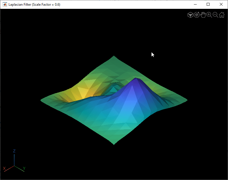 numIterations = 5; for scaleFactor = [0.3 0.6 0.9] surfaceMeshOut = smoothSurfaceMesh(surfaceMeshIn,numIterations,Method="Laplacian",ScaleFactor=scaleFactor); fig = figure; v = viewer3d(fig,BackgroundColor="k",BackgroundGradient="off",Title="Laplacian Filter (Scale Factor = "+scaleFactor+")"); surfaceMeshShow(surfaceMeshOut,'Parent',v) end