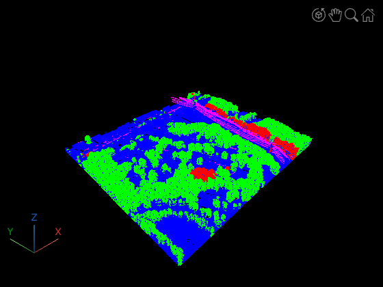 % Set color for each point in point cloud color = repmat([0 0 1],ptCloud.Count,1); % Blue color(powerlineIndices,:) = repmat([1 0 1],nnz(powerlineIndices),1); % Magenta - Powerlines color(nonRiskTreeIndices,:) = repmat([0 1 0],nnz(nonRiskTreeIndices),1); % Green - Safe trees color(riskTreeIndices,:) = repmat([1 0 0],nnz(riskTreeIndices),1); % Red - Risk trees pcviewer(ptCloud,color);