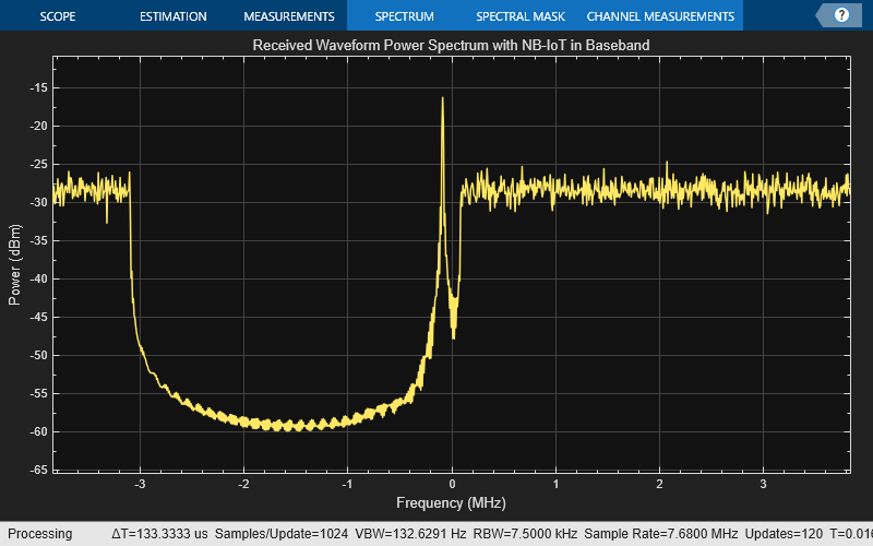 rxWaveformB = lteFrequencyCorrect(ltecfg,rxWaveform,offset); % Received waveform with NB-IoT in baseband combinedSpecPlotB = spectrumAnalyzer('SampleRate',lteInfo.SamplingRate,'Title','Received Waveform Power Spectrum with NB-IoT in Baseband'); combinedSpecPlotB(rxWaveformB);
