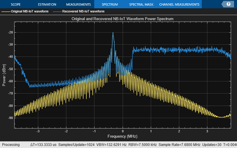 filteredSpecPlot = spectrumAnalyzer('SampleRate',lteInfo.SamplingRate,'Title','Original and Recovered NB-IoT Waveform Power Spectrum', ... 'ChannelNames',{'Original NB-IoT waveform','Recovered NB-IoT waveform'},'ShowLegend',true); filteredSpecPlot([nbiotWaveform,rxwave]);