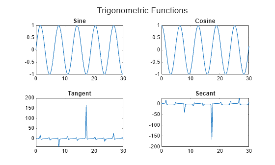 Figure contains 4 axes objects. Axes object 1 with title Sine contains an object of type line. Axes object 2 with title Cosine contains an object of type line. Axes object 3 with title Tangent contains an object of type line. Axes object 4 with title Secant contains an object of type line.