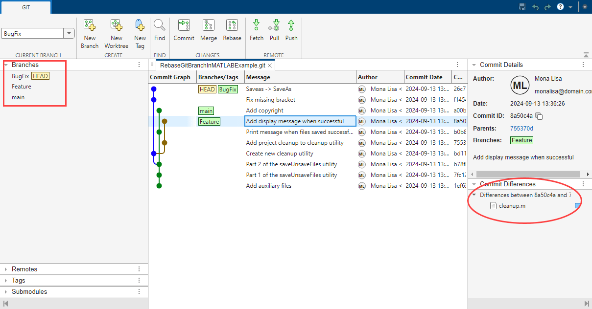 Tip: Before you rebase, you can combine commits into a single commit using Git squash. For an example, see Squash Git Commits in MATLAB.